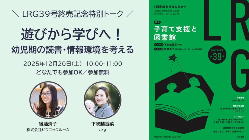 2022年05月に発売されました『ライブラリー・リソース・ガイド』(LRG)第39号「子育て支援と図書館」がまもなく終売を迎えます。